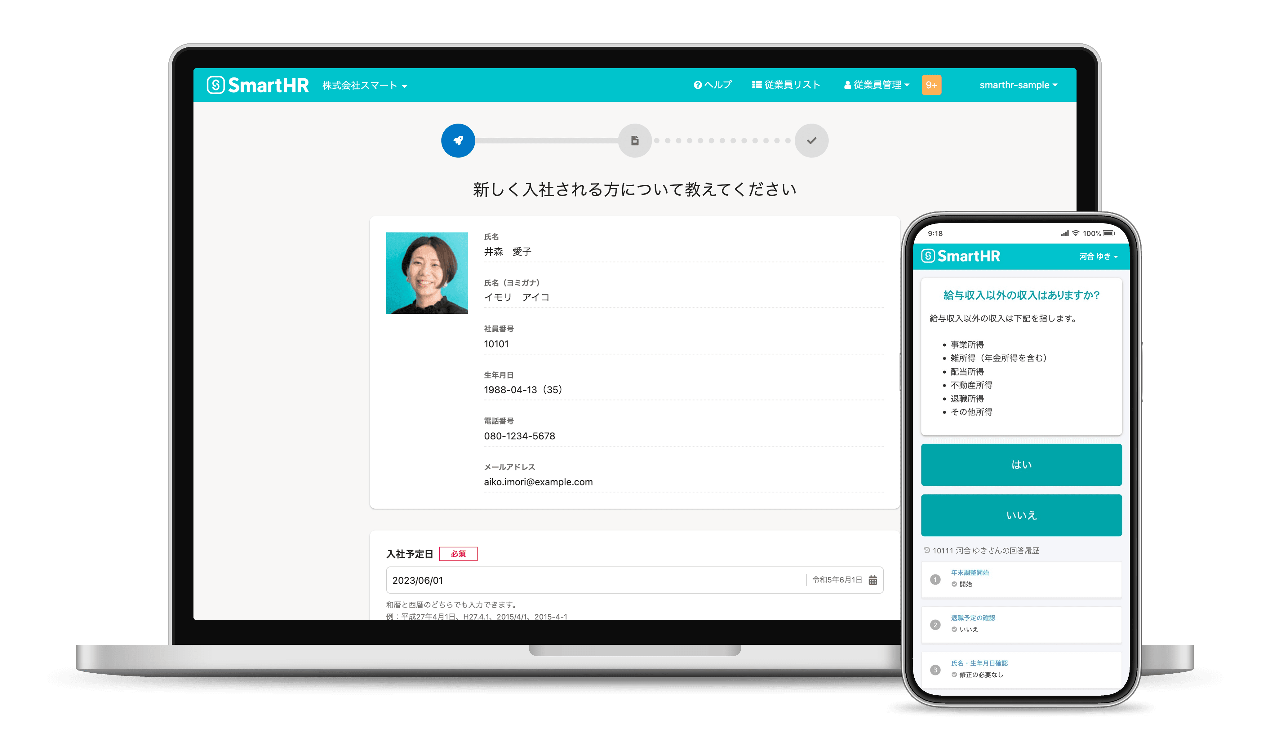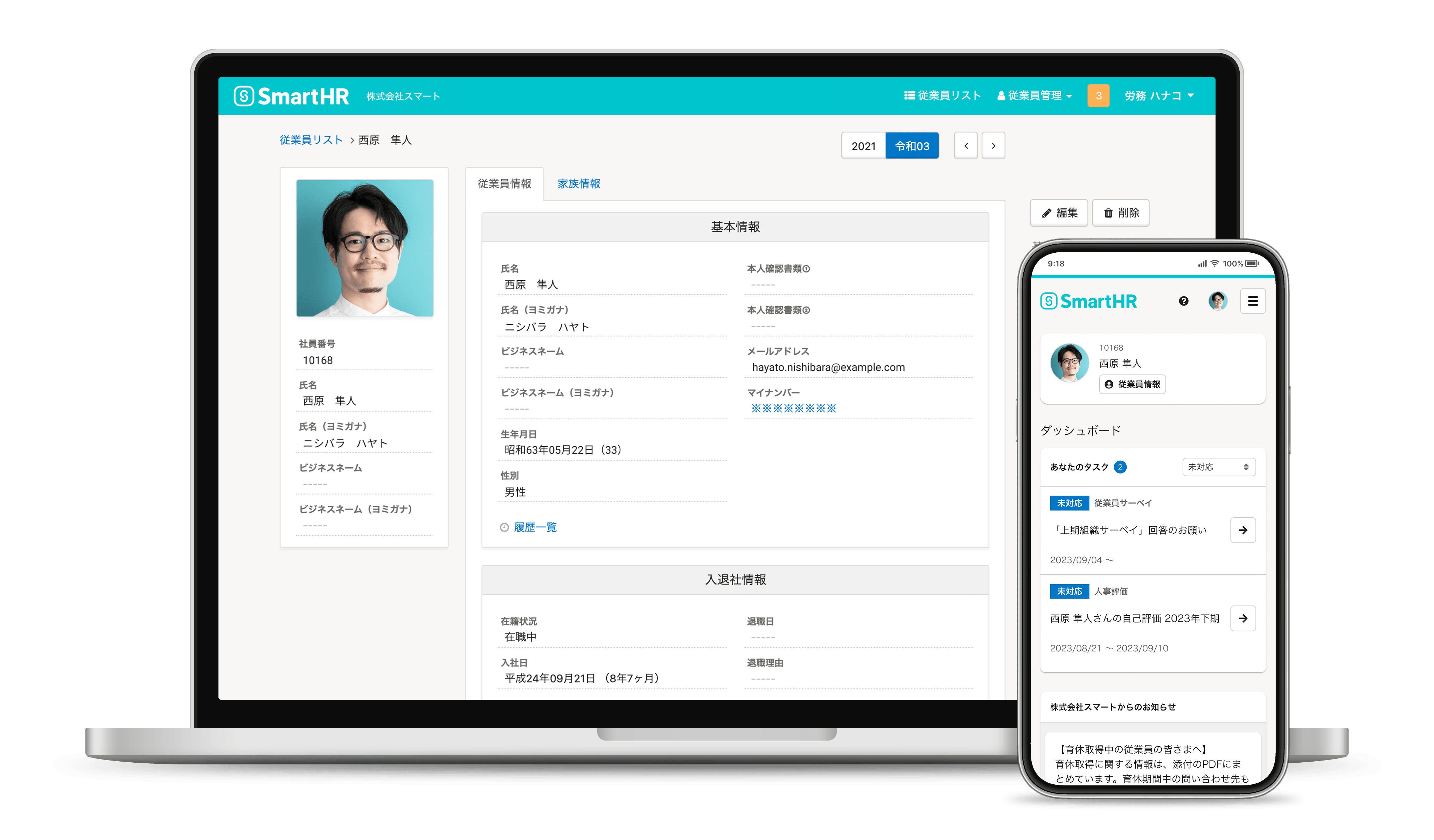 (使用キャプチャ: SmartHR本体 従業員情報詳細(管理者)| Google ドライブ・SmartHR基本機能 SmartHRのホーム フォーマル スマートフォンサイズ)