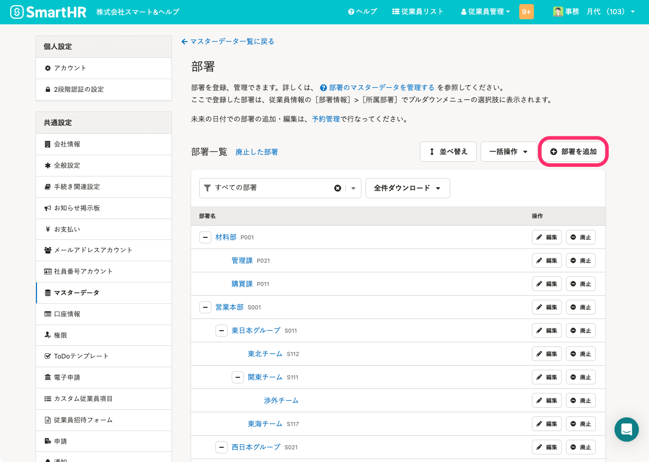 代替テキスト:部署画面のスクリーンショット