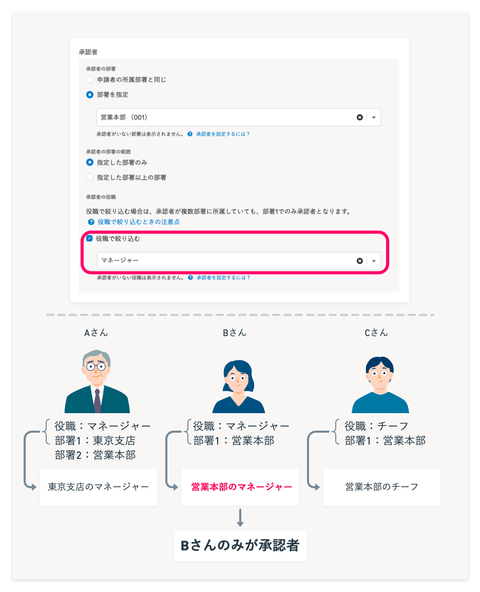 本文: 例えば、下記のように設定した場合は、部署1が[営業本部]かつ役職が[マネージャー]のBさんのみが承認者となります。