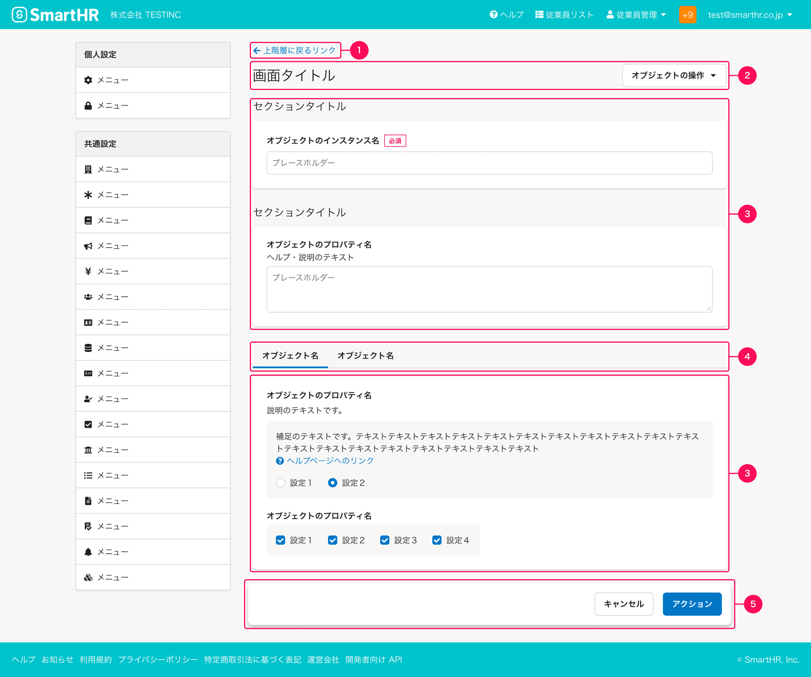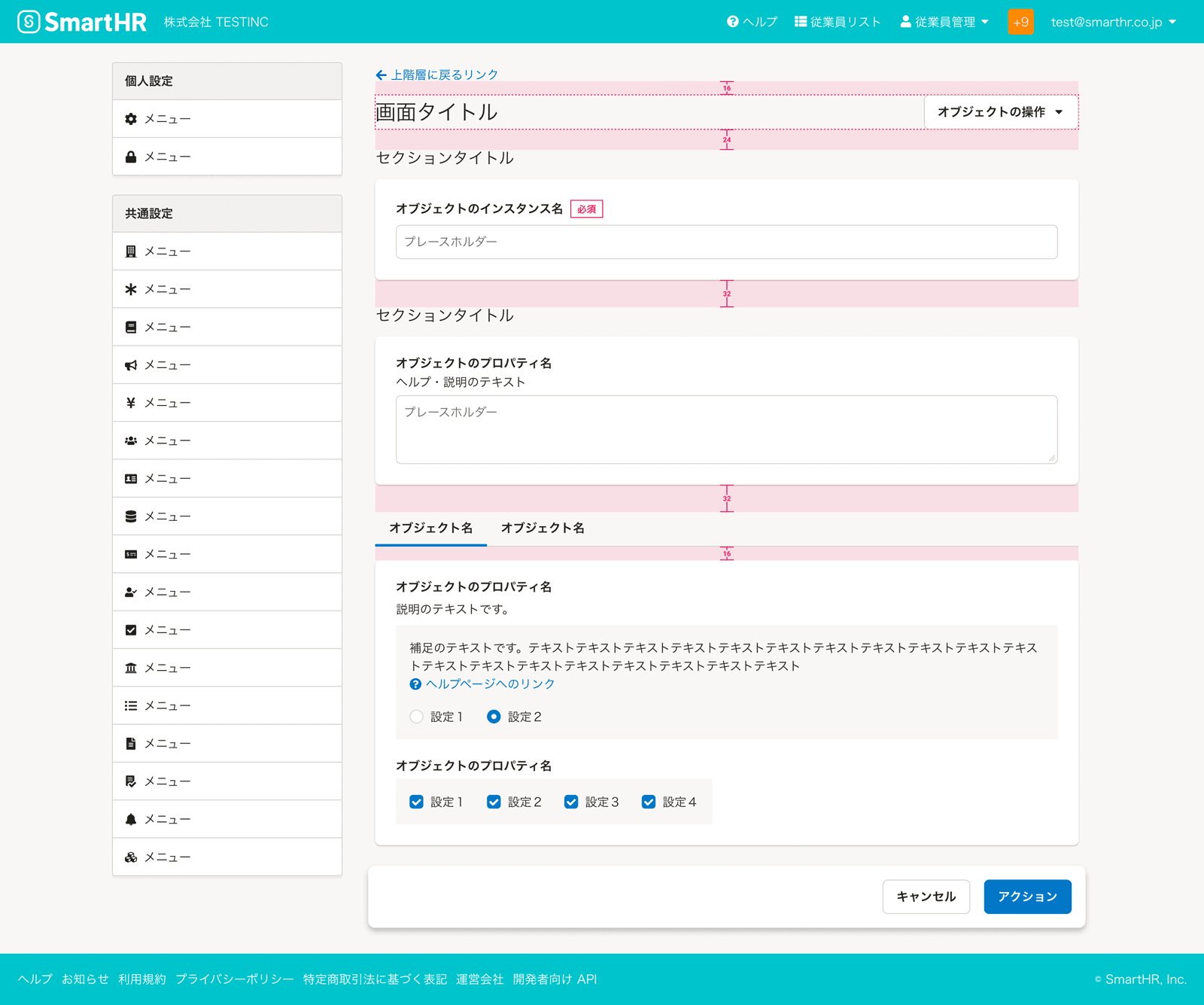オブジェクトの持つさまざまなプロパティを設定するフォーム入力要素を配置するエリアです。 代表的なフォーム入力要素としては、FormControlやFieldset、Inputを使用したテキスト入力のほか、共通設定の操作権限項目といったチェックボックスやラジオボタンを組み合わせた設定項目などがあります。