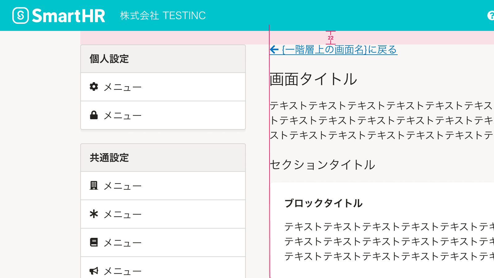 基本機能の共通設定のように、メインコンテンツにサイドナビゲーションが隣接する場合は、左矢印 アイコンをメインコンテンツの左端に合わせて配置します。