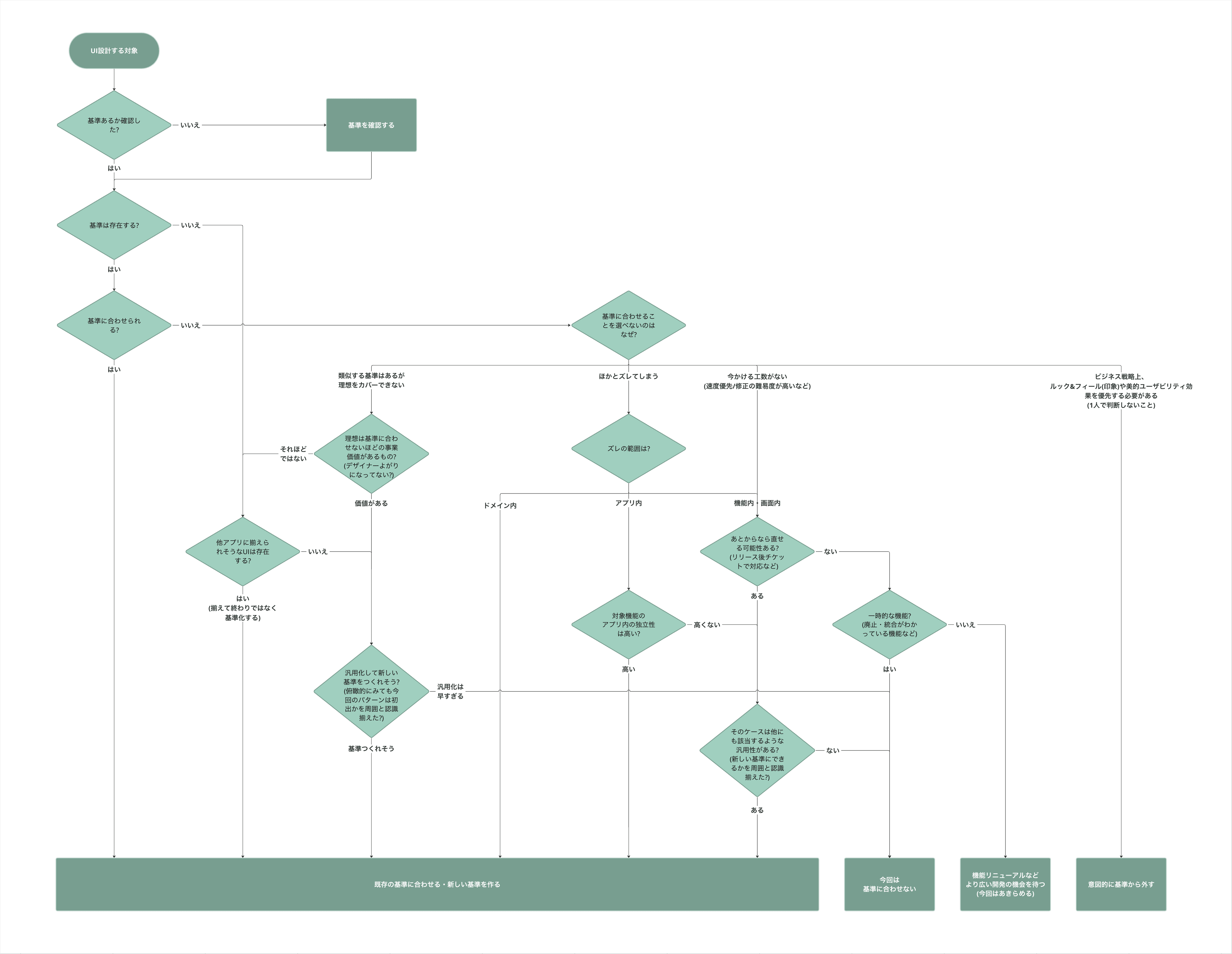 基準判定フローチャートは、このような状況を客観的に分析し「基準に合わせるべきか・あえて合わせない方がよいか」の判断を支援するためのツールです。